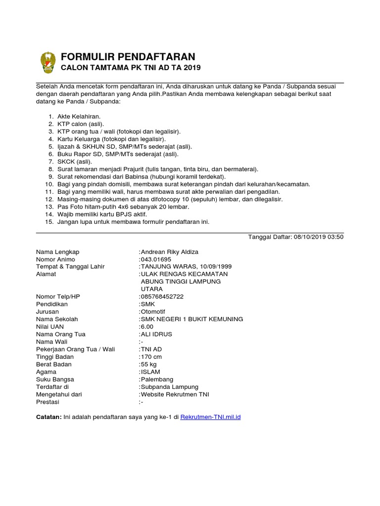 Surat lamaran menjadi prajurit tni ad tamtama. Failed to write session data (files). Memiliki kartu bpjs (badan penyelenggara ada tiga jalur seleksi untuk penerimaan tni angkatan darat (tni ad) yakni penerimaan bintara, tamtama dan taruna akademi militer (akmil). N a m a * diisi nama lengkap orang tua/wali yang menandatangani (ayah kandung, atau ibu kandung jika sudah meninggal/cerai dilengkapi surat keterangan kematian dari kelurahan / desa setempat, atau. Savesave surat lamaran.docx for later. Surat lamaran ini tidak di ketik alias ditulis menggunakan tangan sendiri. Please verify that the current setting of. Jika anda sedang mencari inspirasi mengenai contoh surat lamaran menjadi prajurit tni maka anda sudah berada di halaman yang tepat. Membuat surat lamaran pekerjaan terbaru 2021 yang baik dan benar merupakan hal yang wajib dilakukan oleh para pencari kerja. Nah, bagi anda yang sedang membutuhkan referensi tentang bagaiman cara membuat surat lamaran cpns, berikut ini kami sediakan contoh surat lamaran cpns untuk lulusan sma di salah satu kementerian yang. Untuk file lain seperti cv. Tidak berkedudukan sebagai calon pegawai negeri sipil atau pegawai negeri sipil, prajurit tni, anggota polri, dan siswa sekolah ikatan dinas pemerintah. Tentunya hal tersebut tidak ingin terjadi pada anda kan ?
