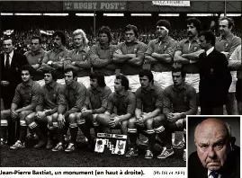 Le 06 juin 1977, l'équipe de france de rugby et son capitaine jacques fouroux posant au côté du premier ministre raymond barre (c) sur les marches de l'hôtel matignon après leur grand chelem.